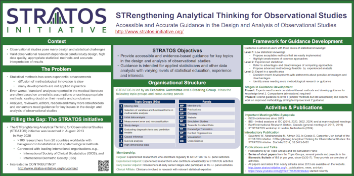 The Steering Group has decided to start with seven topics of general interest. Two topic groups were added later. Guidance documents will be developed by separate topic groups (TGs), each comprising experts in different area of statistical methodology, alongside applied researchers who may represent future end-users of the STRATOS documents. Each TG will start by developing guidance aimed primarily at level 2 statistical knowledge, which is perhaps slightly below state of the art. STRATOS structure and the initial road map from Sauerbrei et al 2014. The STRATOS initiative is closely connected to the International Society of Clinical Biostatistics (ISCB) and was launched at a half-day Mini-Symposium on the last day of the ISCB meeting in Munich, in August 2013.